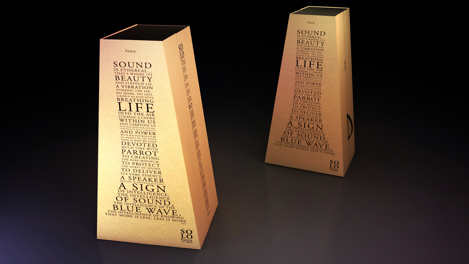 Le packaging repensé, mais toujours soulignant les valeurs luxe et tournée vers l'expérimental de la marque, tout à la fois plus légé, plus sobre et raffiné, et plus proche de l'enceinte elle même. Le packaging dessine subtilement la silhouette devenu signe, de l'enceinte tout en énumérant ces caractéristiques dans sa définition poétique tenu par Philippe Starck lui même.