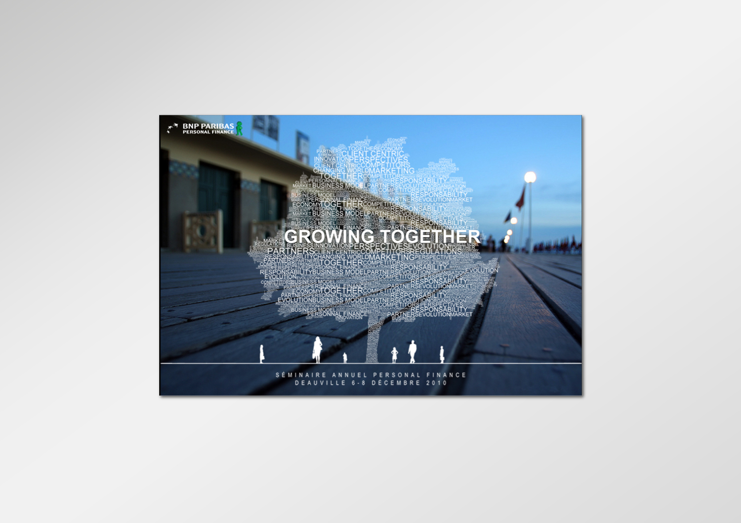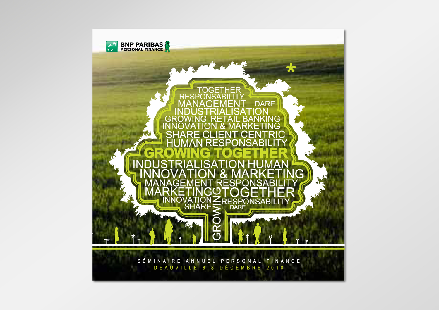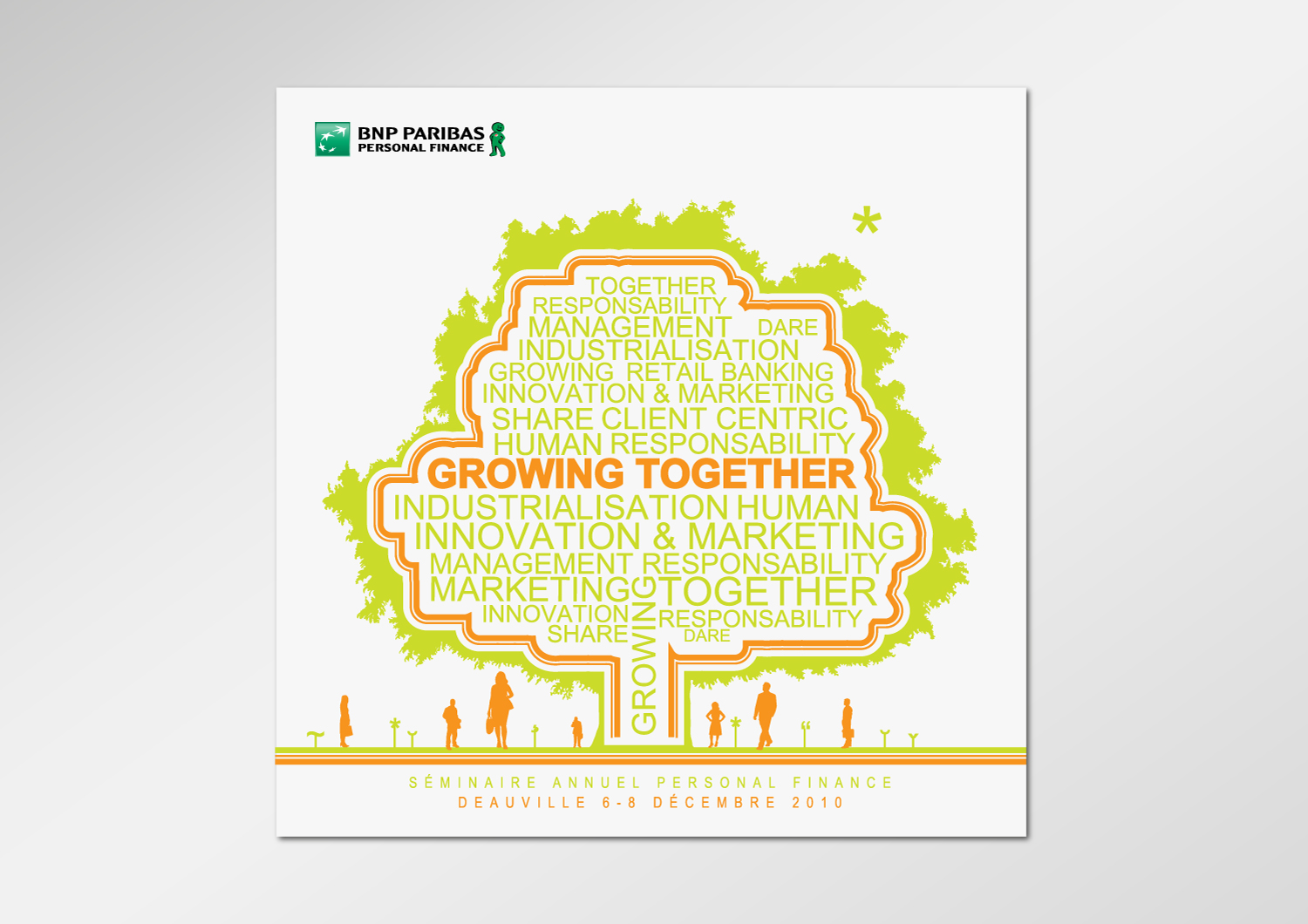 Dans l'idée du séminaire porter sur la finance, l'idée a été de centrer toutes les notions d'évolutions, de croissances, d'évolutions, de partenariats, dans un assemblage typographique reprenant comme symbole la croissance via l'imagerie de l'arbre, donner une sensibilité humaine et naturelle à cette événement institutionnel et financier tout en préservant et en mettant en avant les notions évoquées.