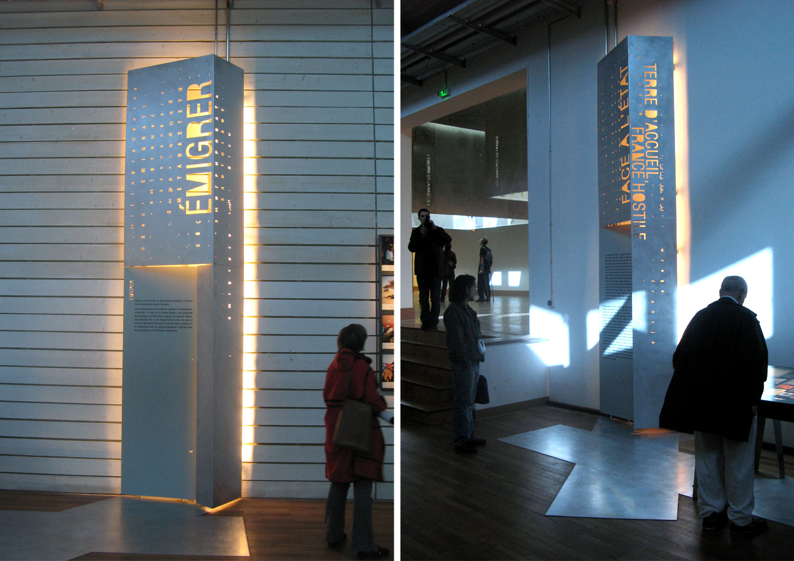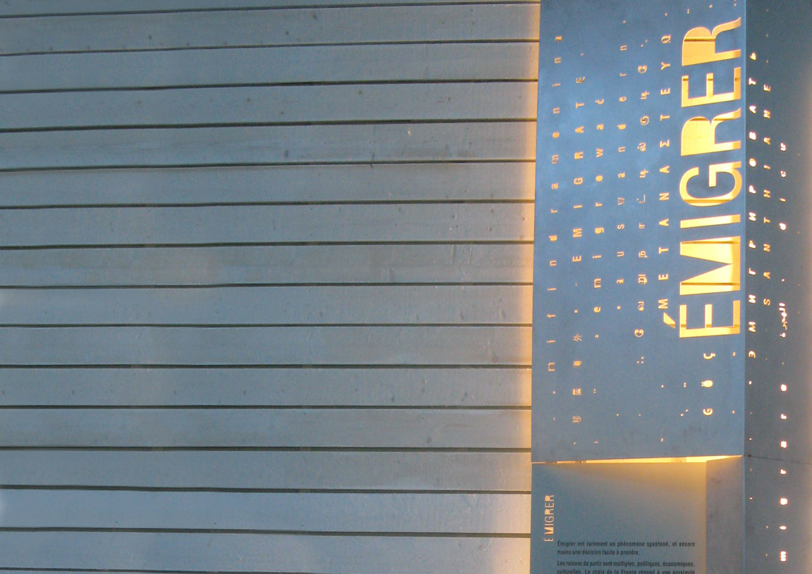 Le parcours scénographique, conçu comme un dispositif de mémoire, original et inédit, au cœur même de la Cité, a cherché à relier les visiteurs à l'histoire collective des immigrations et aux histoires singulières de migrants, attachés à développer cette double dimension de l'individuel et du collectif comme moteur dynamique d'expériences à vivre pour tous les publics, sur un parcours qui traverse deux cents ans d'histoire de l'immigration en France.