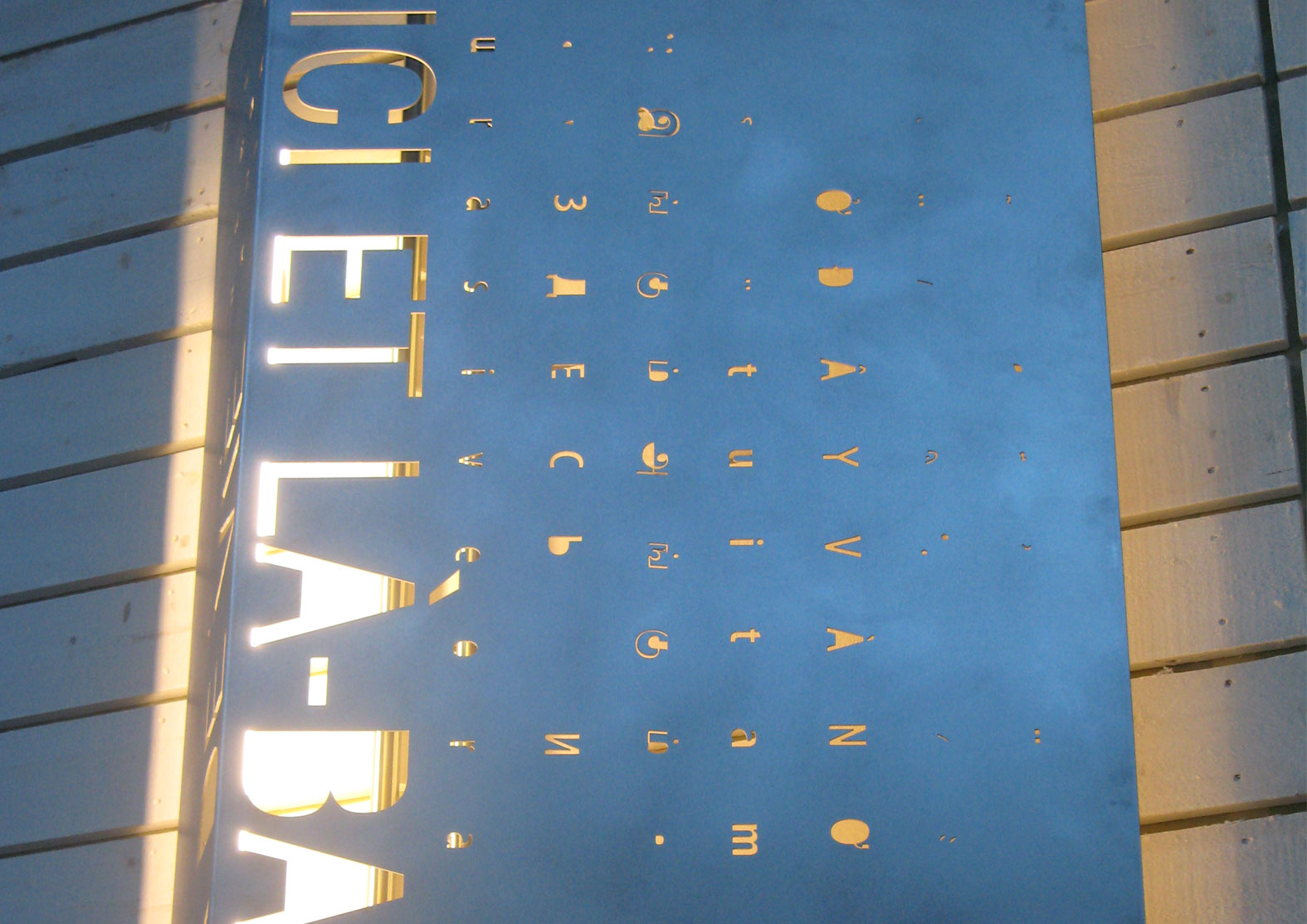 Tandis que les panneaux en métal rétroéclairés ponctuent le parcours d'une constellation typographique et linguistique de toute origines.