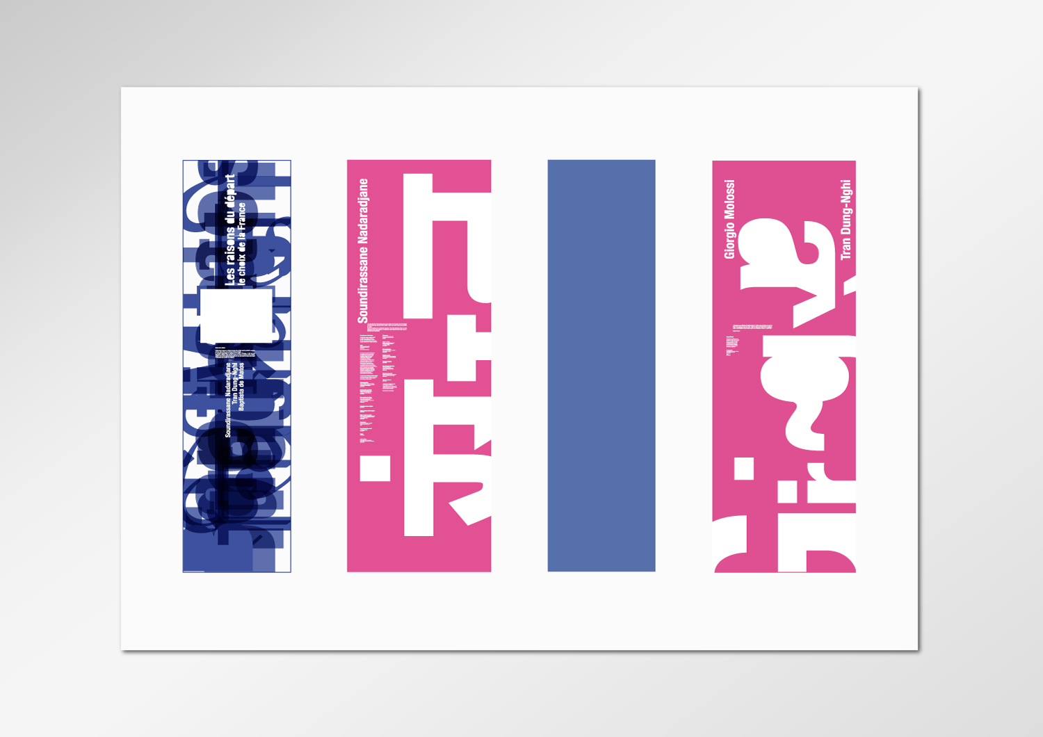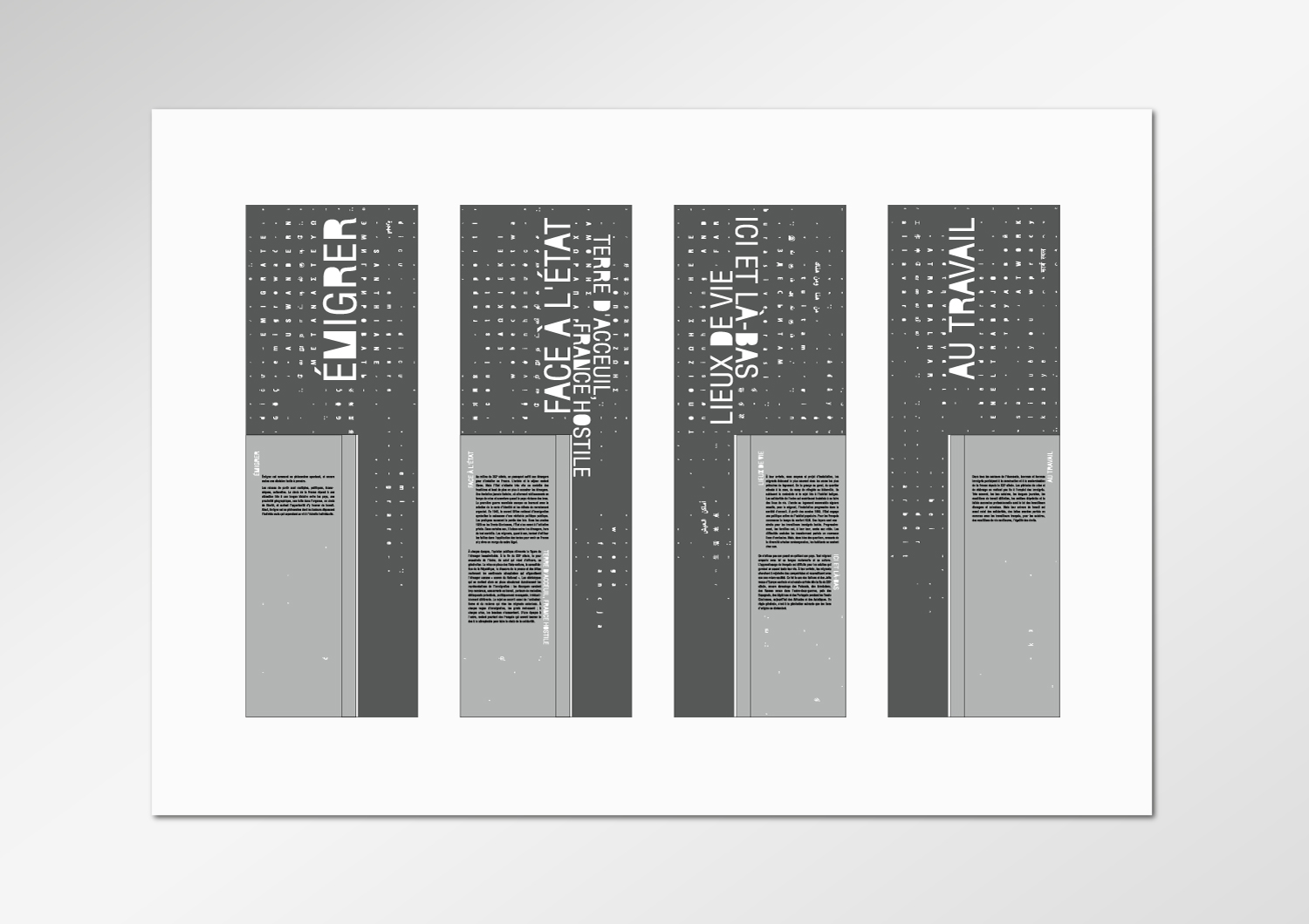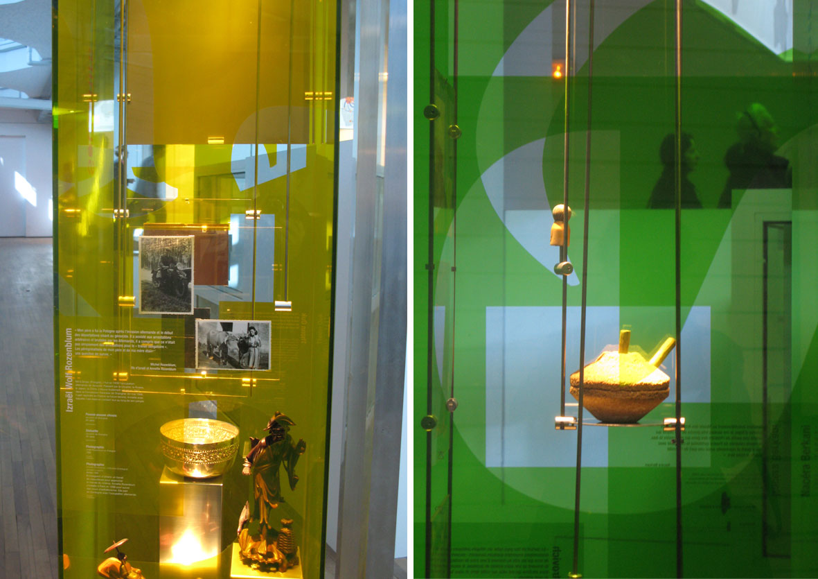 Des donts d'objets et tranches d'histoires personnelles abrités dans des vitrines modulaires spécialement conçues et dédiées où le graphisme joue sur un jeu de typographie mêlant différents alphabets, offrant des fenêtres graphiques et mettant en lumière les objets qui prennent ici la parole.