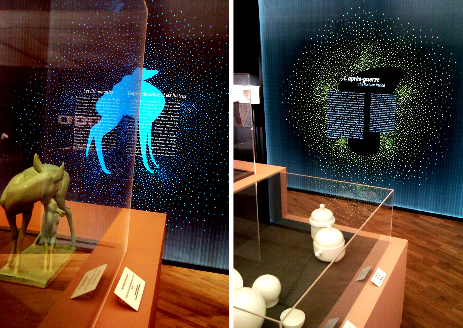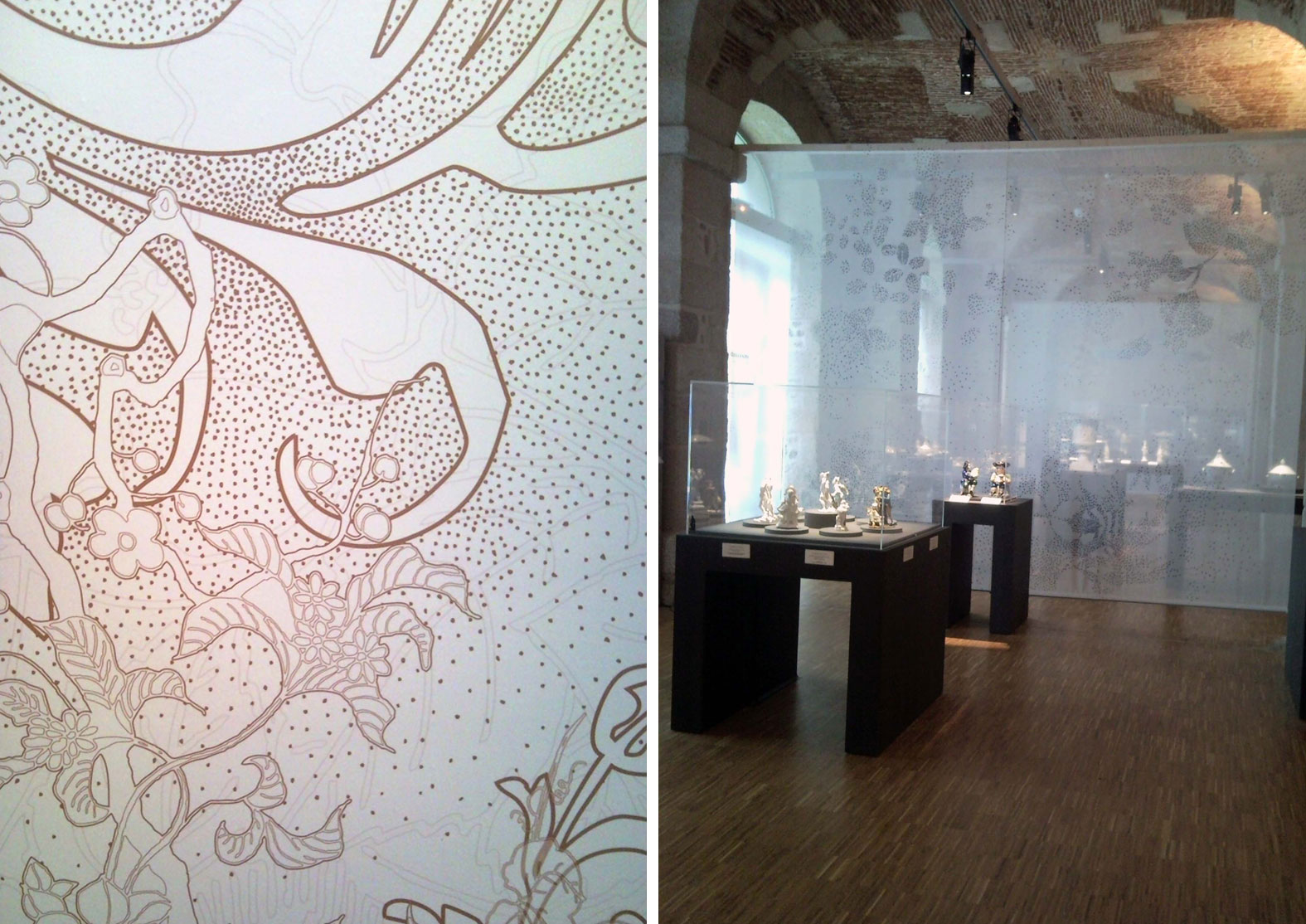 L'esprit de la signalétique souligne la finesse du travail de la porcelaine, la minutie et la précision du geste de l'artisan et offre une rencontre entre les deux écritures et le propos de l'exposition