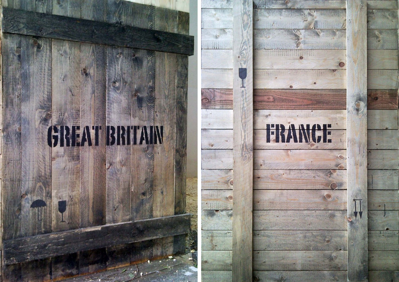La signalétique s'appuie sur le contraste entre une typographie enrichie, raffinée, minutieuse, pour les cartels, et l'aspect usé, poreux, codifié des tampons du voyage, des caisses d'emballage, des frontières traversées.