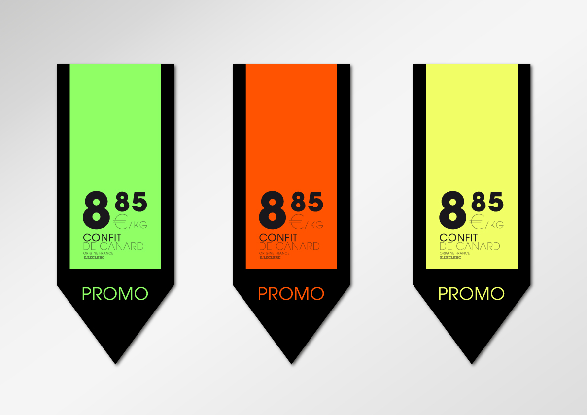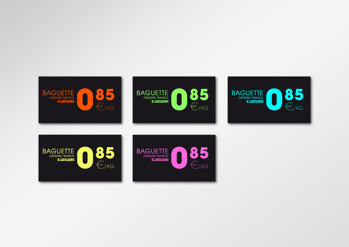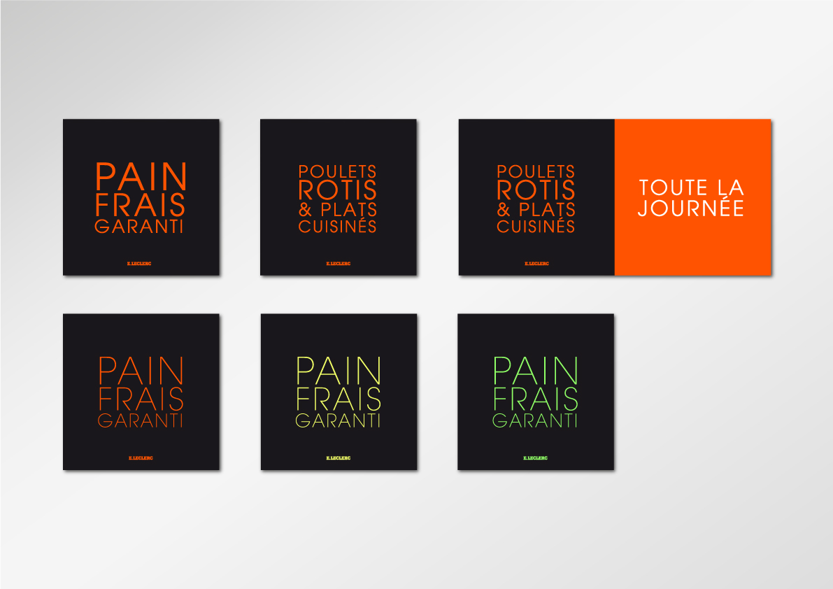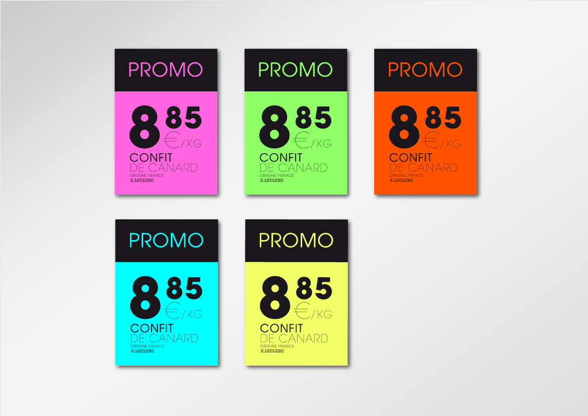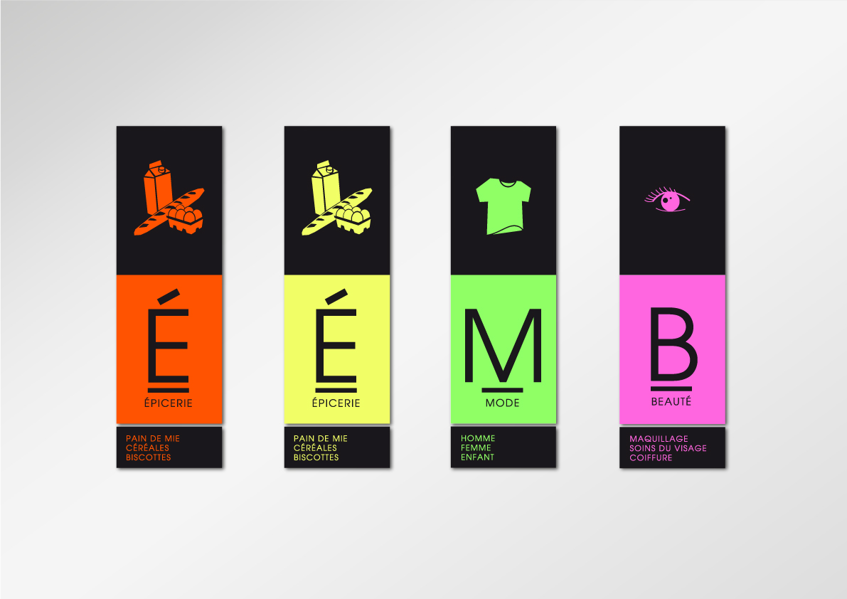Le graphisme, impactant et coloré, simple et ludique, se veut avant tout au service de la visibilité de la compréhension de chaques rayons, des messages institutionnels des différents métiers (boucher, poissonnier…), des promotions et de la clarté des prix, via un système de couleurs "Flashy" et typographique lié à chaques messages, facilitant ainsi l'orientation et l'information des consommateurs.