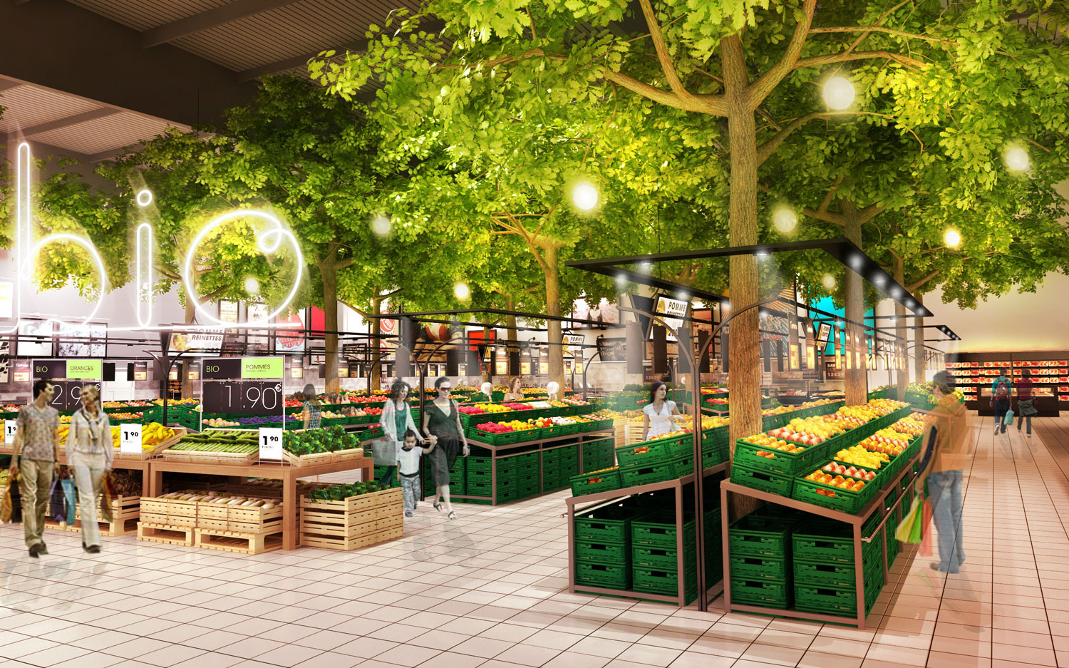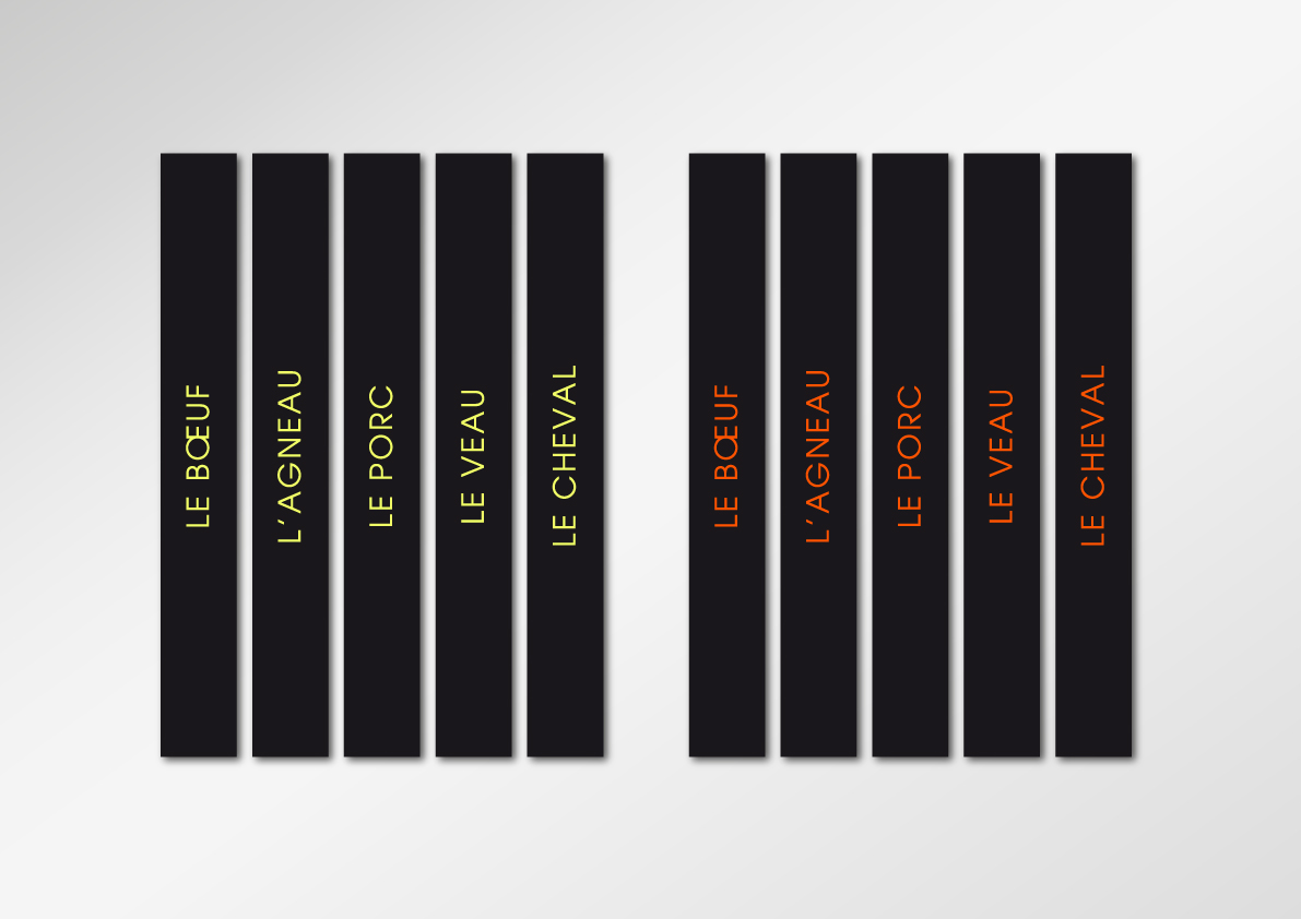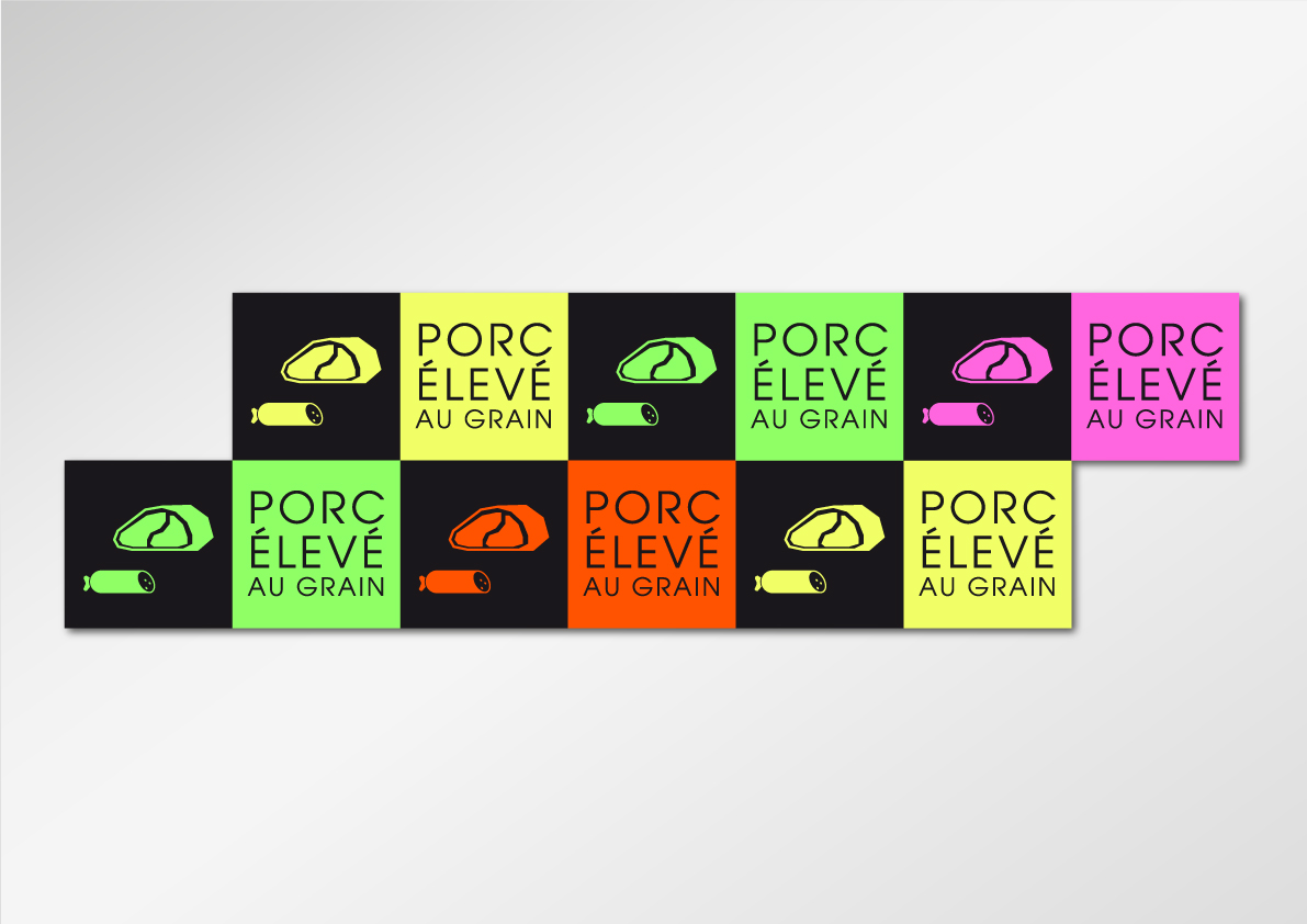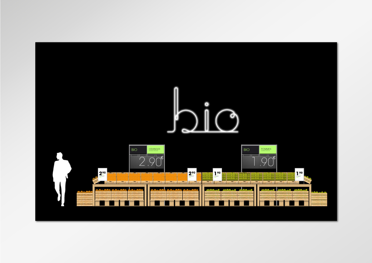 Le graphisme, impactant et coloré, simple et ludique, se veut avant tout au service de la visibilité de la compréhension de chaques rayons, des messages institutionnels des différents métiers (boucher, poissonnier…), des promotions et de la clarté des prix, via un système de couleurs "Flashy" et typographique lié à chaques messages, facilitant ainsi l'orientation et l'information des consommateurs.