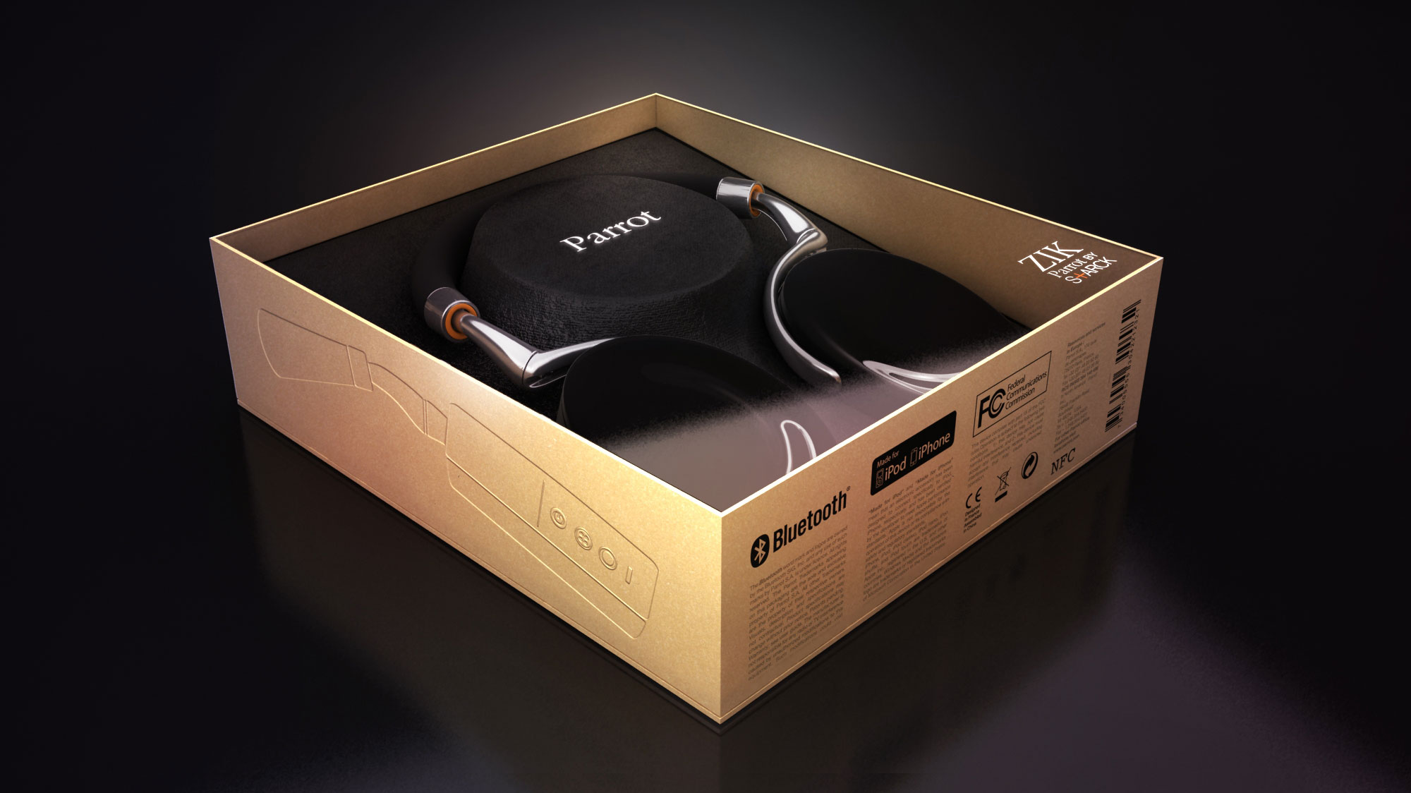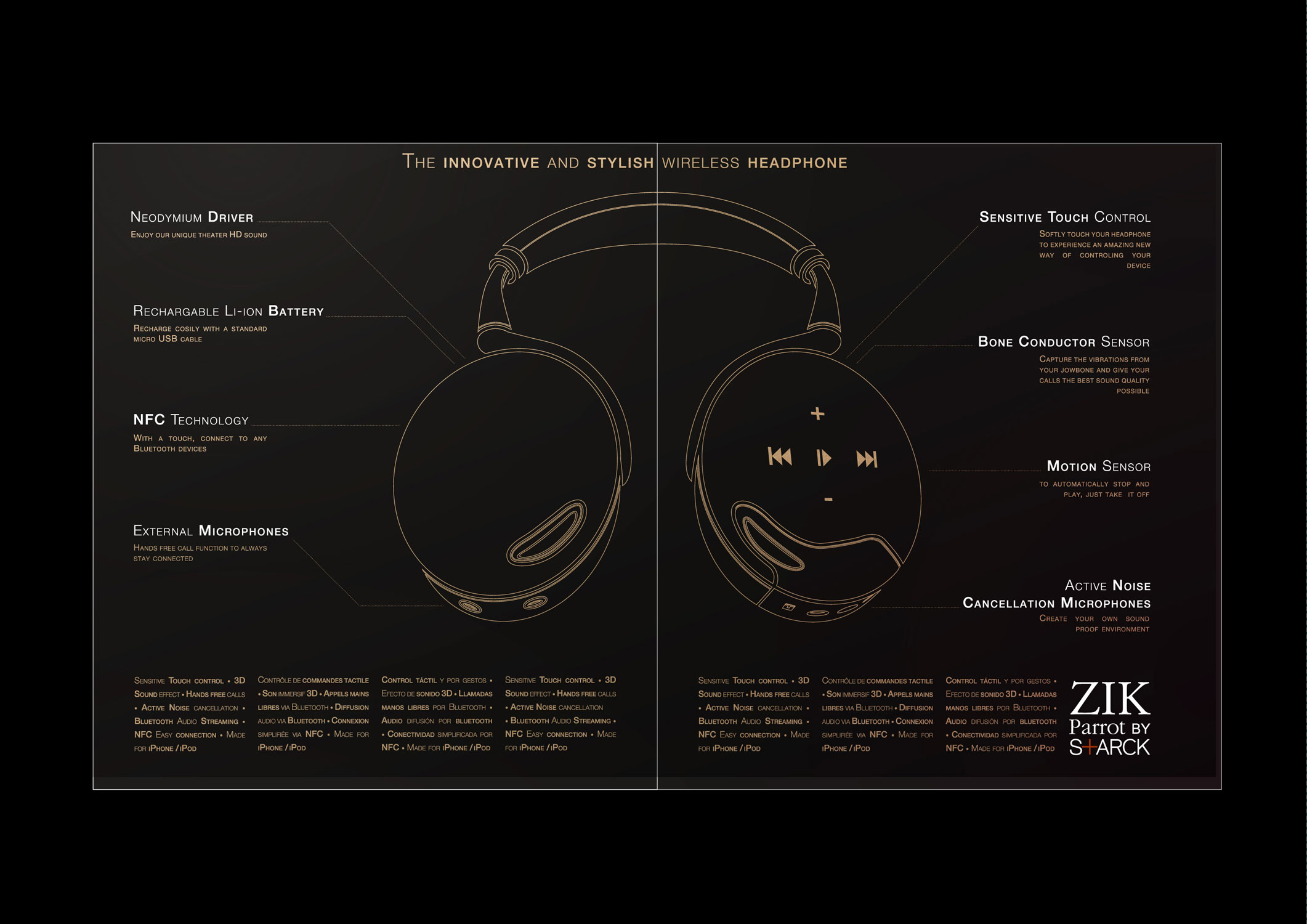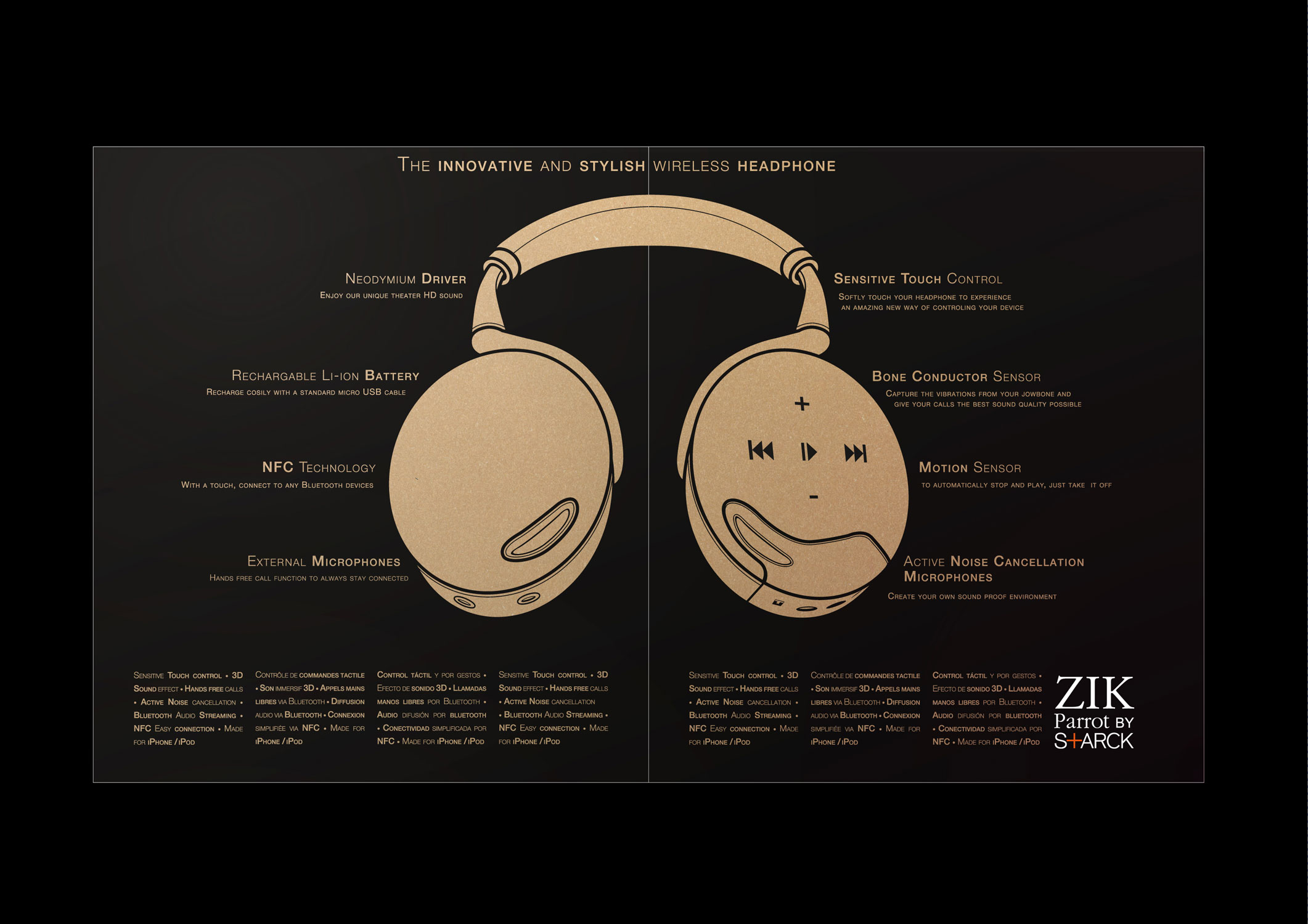 Proposition pour PARROT ZIK. Dans le désir de lancer ce nouveau produit, le casque est un accessoire de mode à la fois sobre et raffiné, un Bijou au même titre que la montre ou l'iphone, il est un signe distinctif redevenu à la mode.