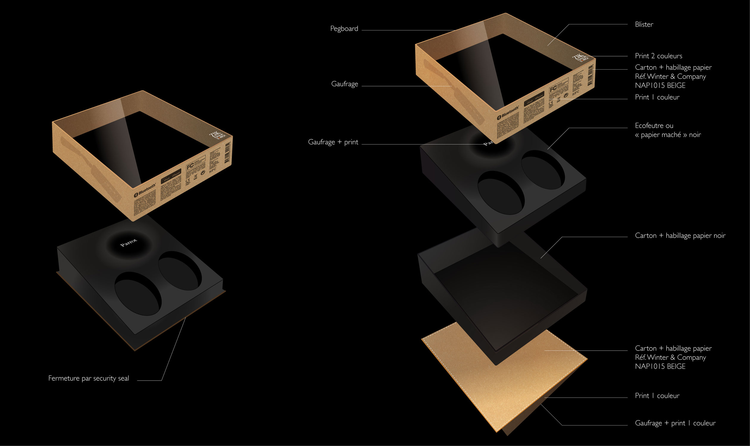 Le packaging pensé, dans le but de sa commercialisation dans les magasins type Fnac mais aussi dans les aéroports type dut free, aide à la visualisation et la compréhension direct et sensorielle du casque.