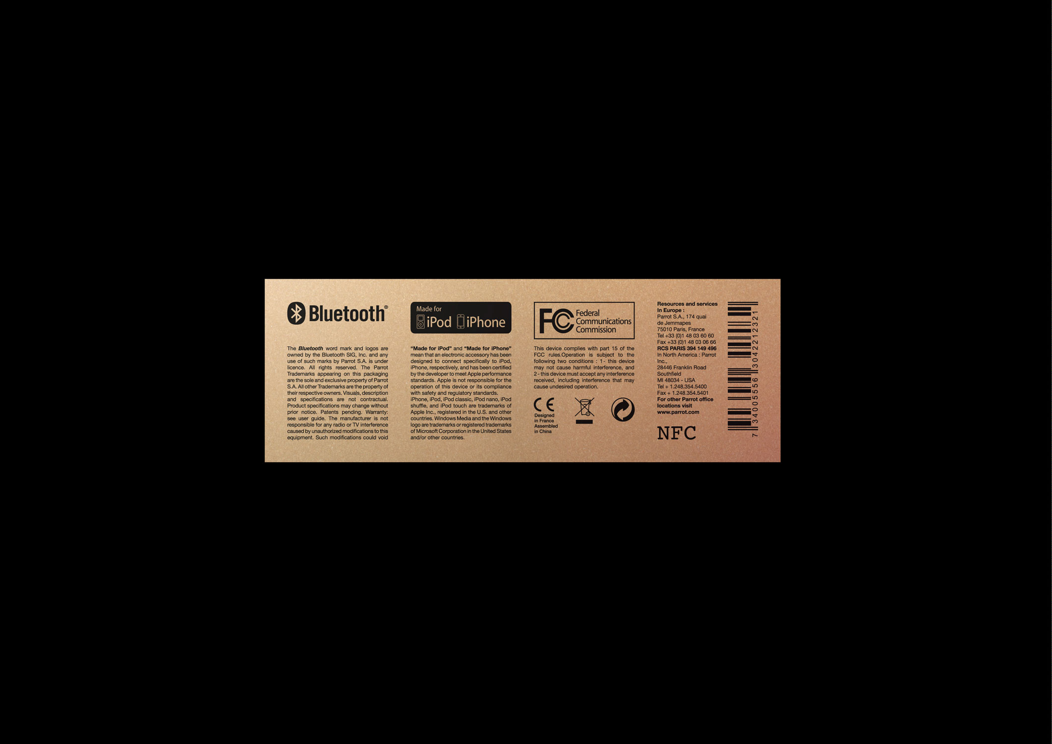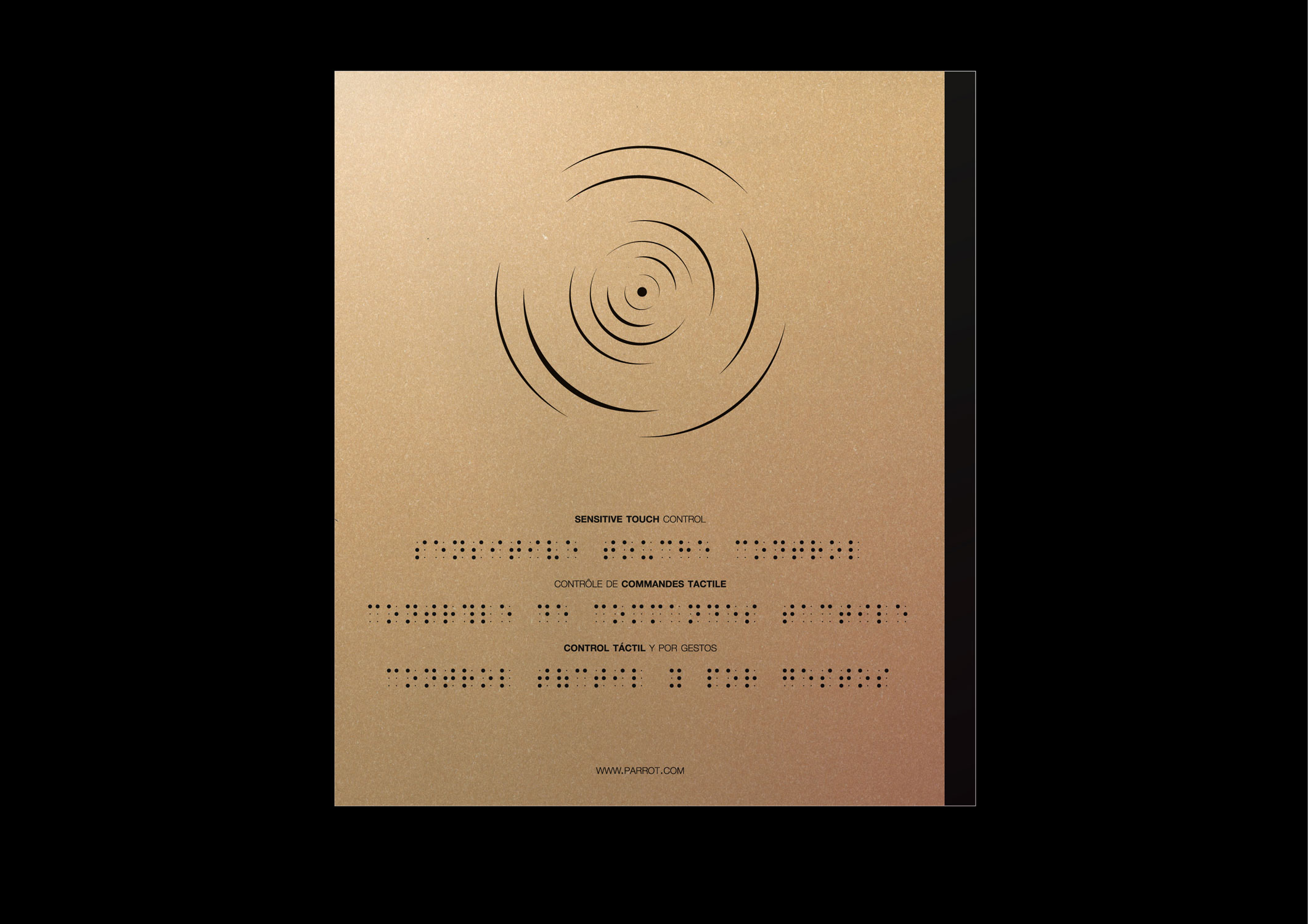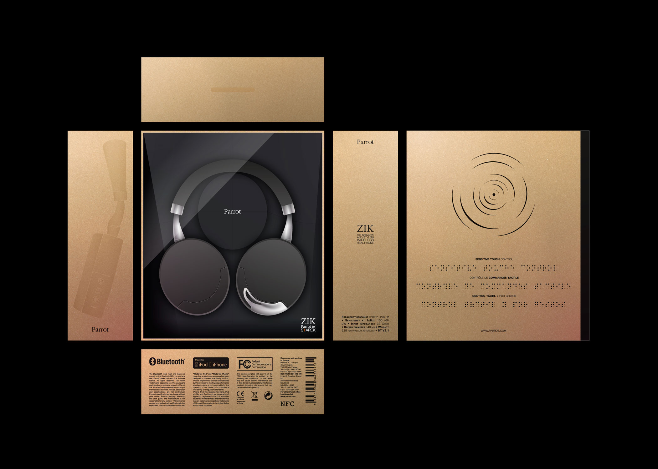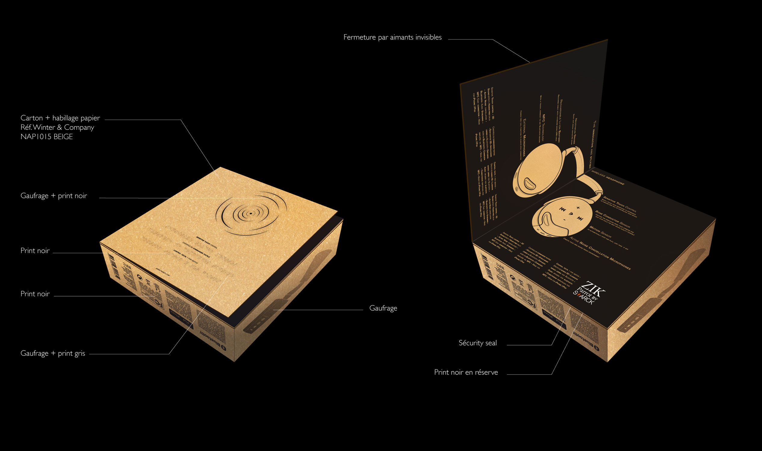 Le dos du packaging évoque subtilement la précision et la beauté de la propagation du son en évoquent les sens par une approche visuelle et tactile (gaufrage + impression noir), tandis que les caractéristiques principales sont énumérées en 4 langues (français, anglais, espagnol et braille rajoutant une compréhension pour tous ainsi qu'à l'expérience tactile).