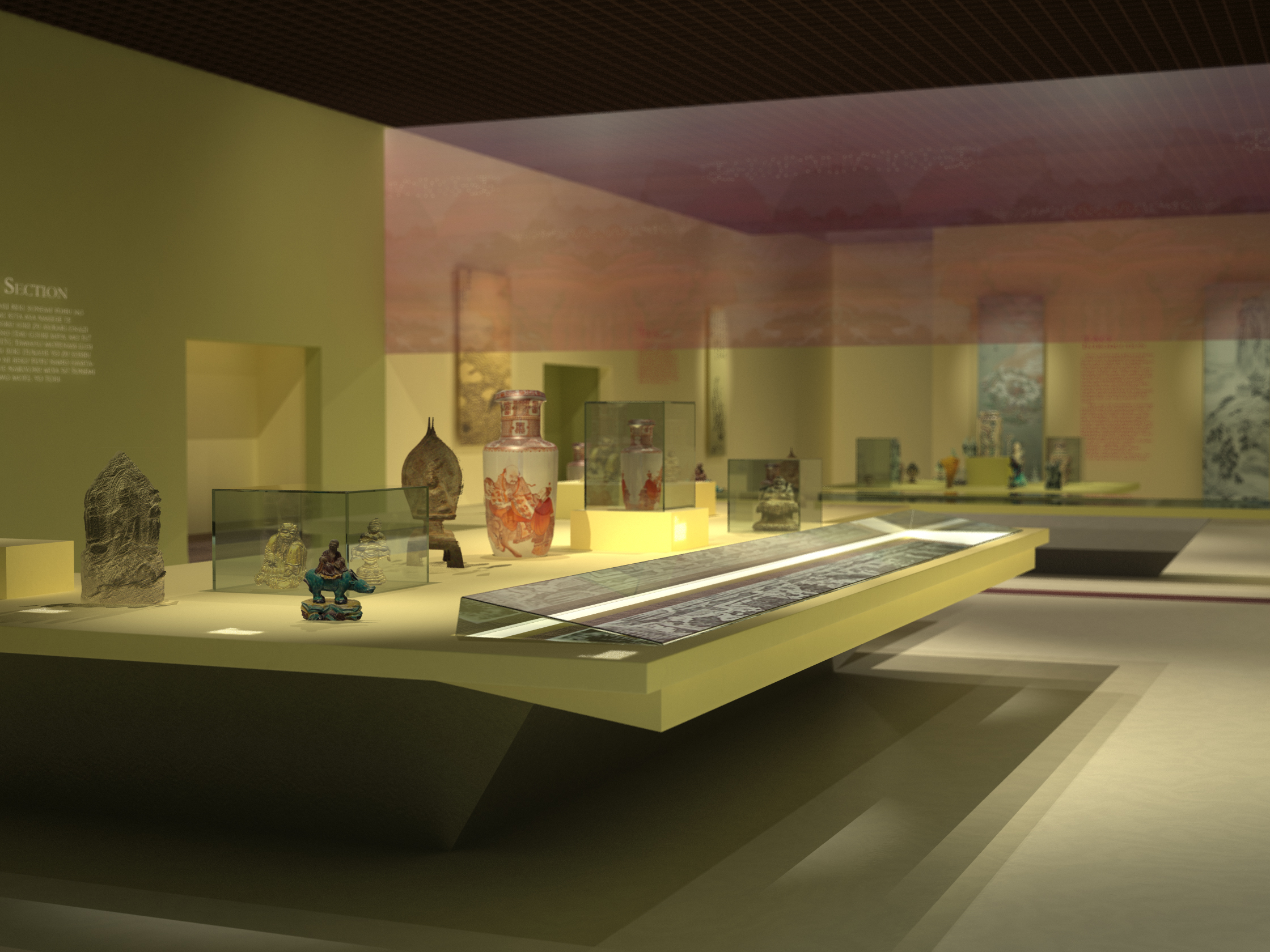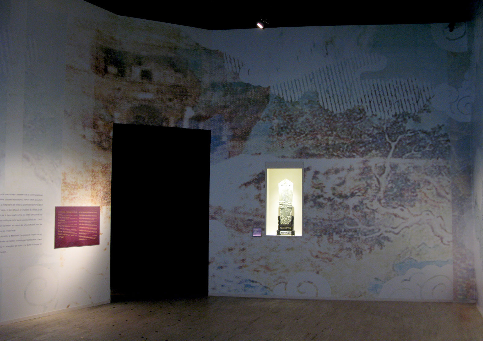 La spécificité de cette exposition est de proposer un dispositif discursif qui permette au visiteur occidental d'approcher à travers une présentation d'œuvres, une philosophie orientale. Elle se fait outil de médiation pour permettre la compréhension des messages élaborés par le commissaire.