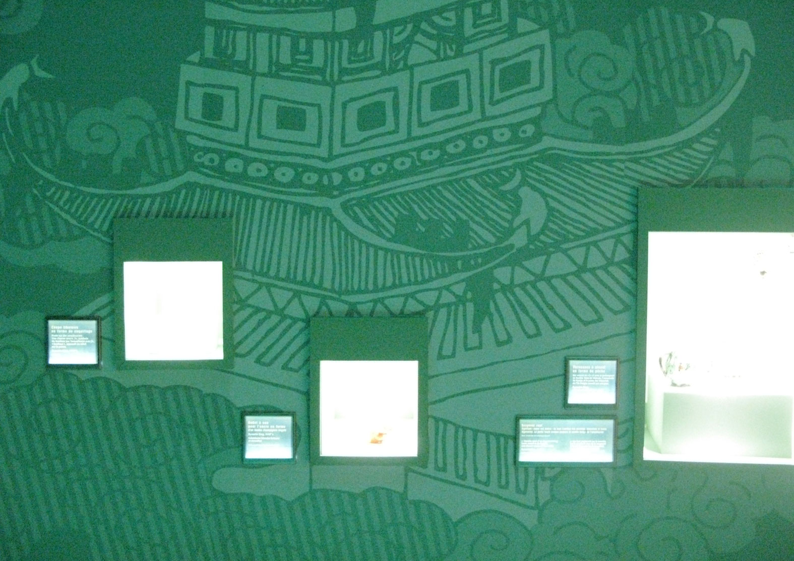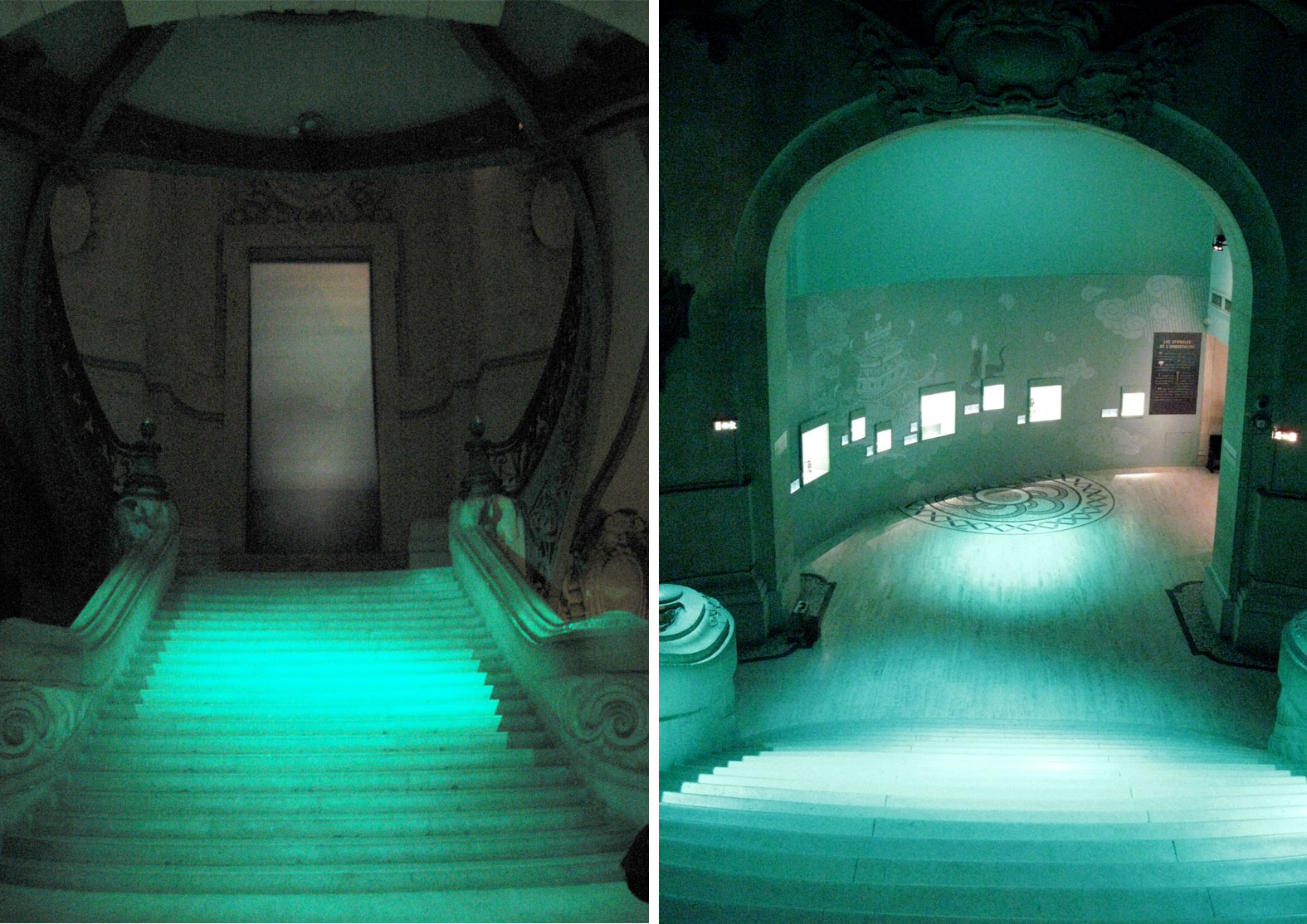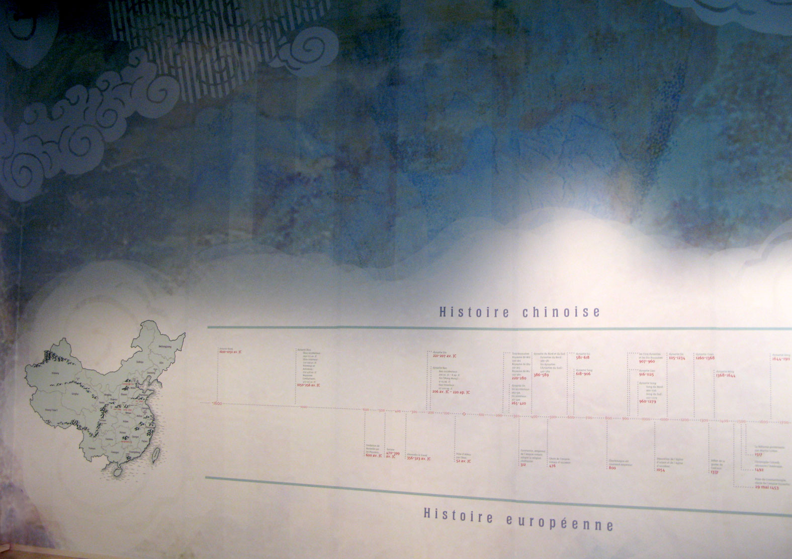 Dans le rythme coloré du parcours, le dispositif de transition entre les thèmes et le graphisme forment un fil d'Ariane qui guide le visiteur à travers les différentes sections. Issue de la profondeur bleutée du cosmos, le souffle du Tao se glisse dans les variations colorées des différentes séquences thématiques jouant le contraste des couleurs emblématiques du Tao. Des nuances de vert, jaune et rouge carmin, sans compter le noir et le blanc, jouent avec la lumière et l'intensité des teintes. Dans chaque espace un jeu sur le clair et le foncé vient renforcer le discours.