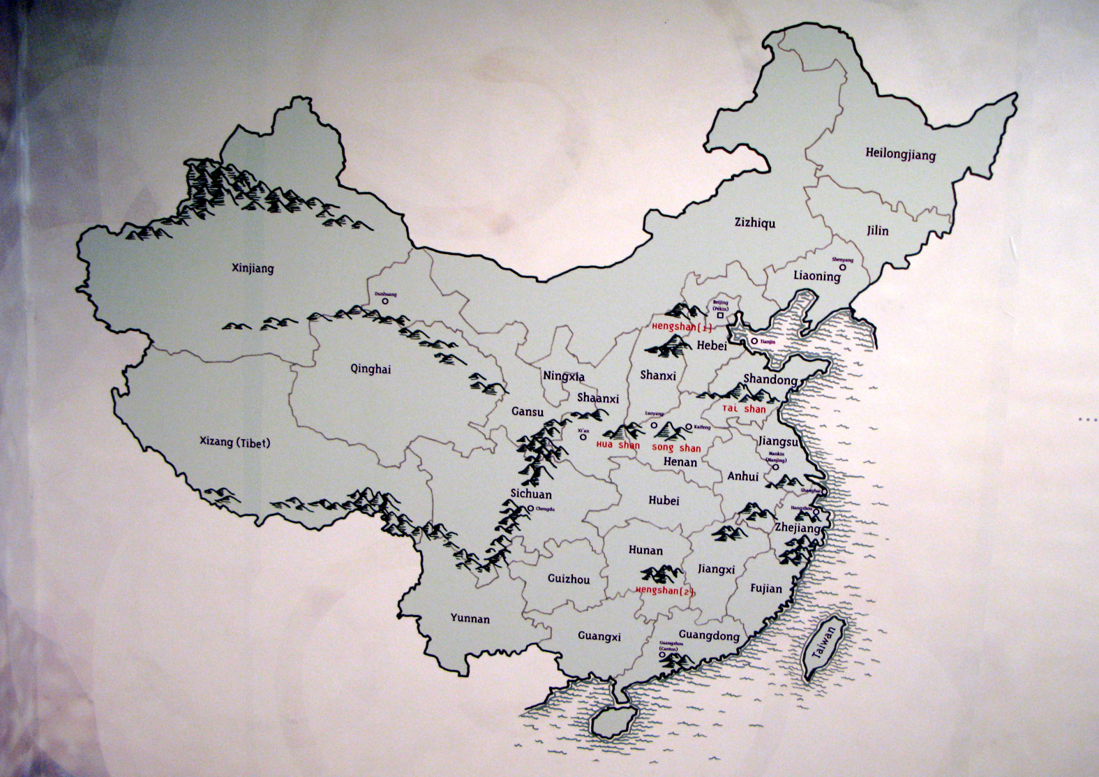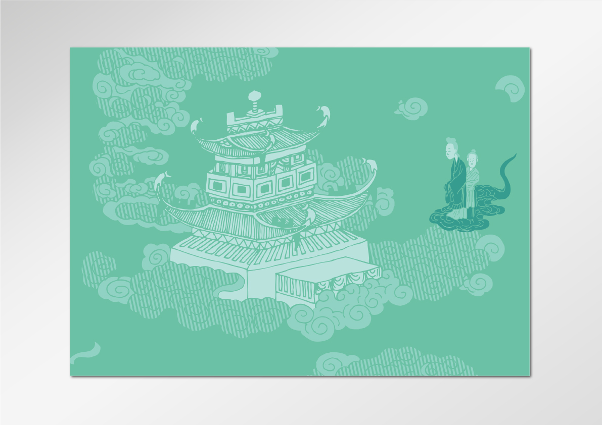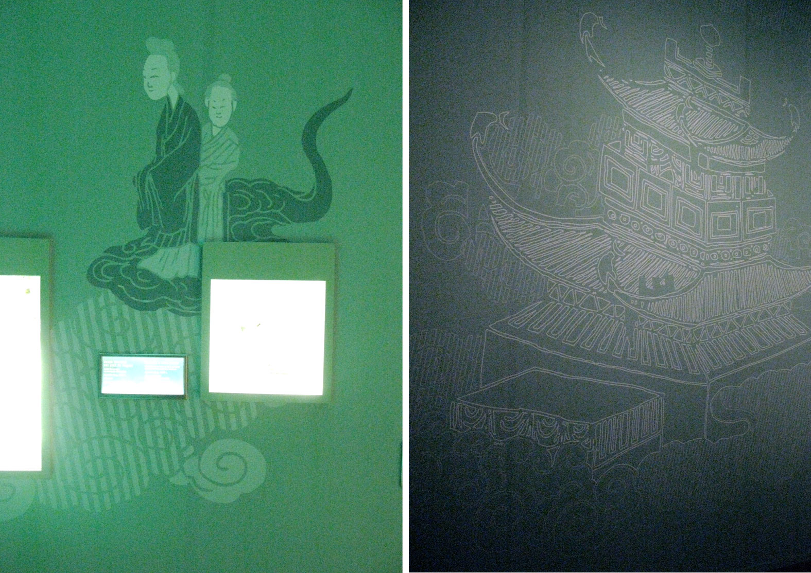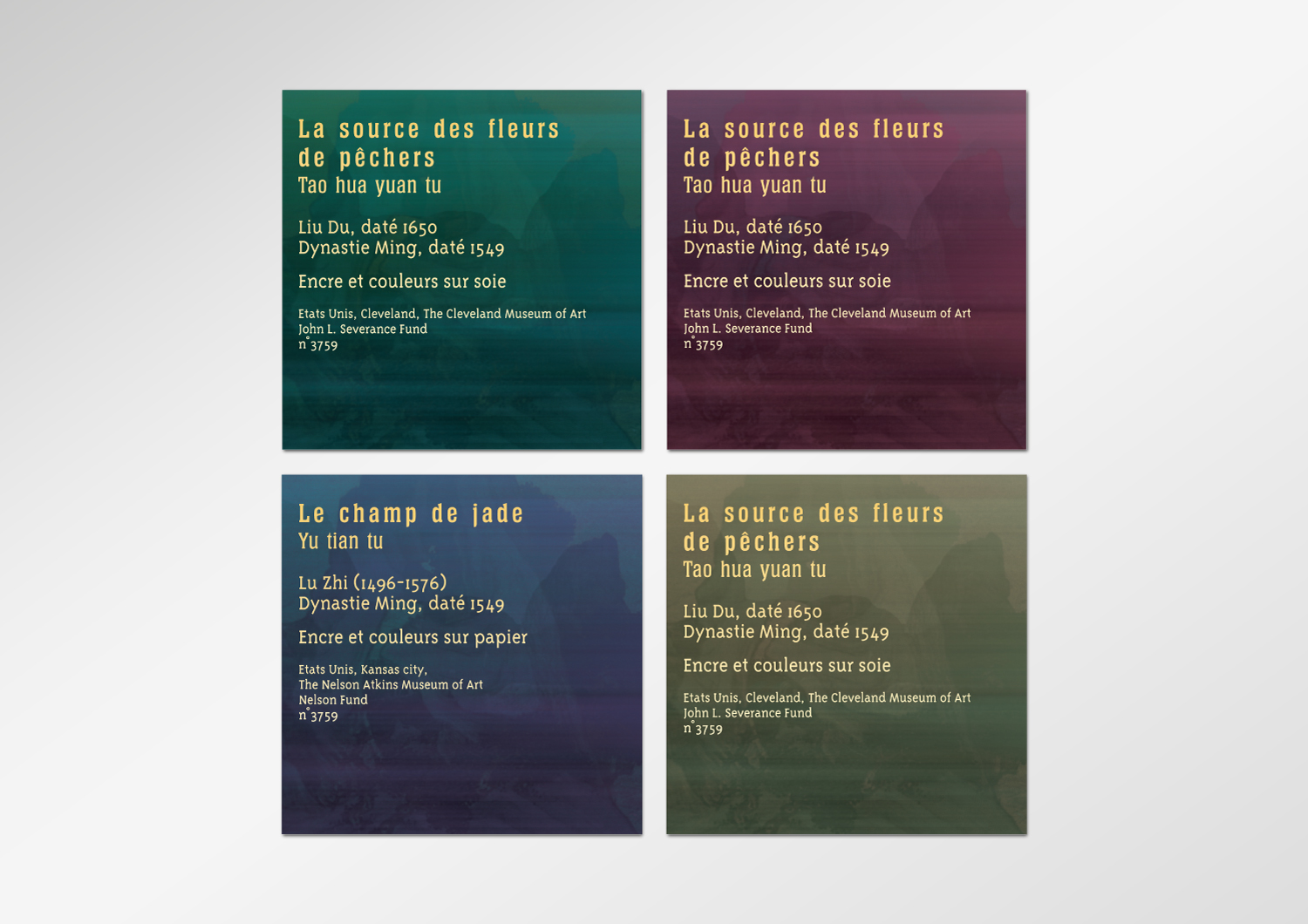 Dans le rythme coloré du parcours, le dispositif de transition entre les thèmes et le graphisme forment un fil d'Ariane qui guide le visiteur à travers les différentes sections. Issue de la profondeur bleutée du cosmos, le souffle du Tao se glisse dans les variations colorées des différentes séquences thématiques jouant le contraste des couleurs emblématiques du Tao. Des nuances de vert, jaune et rouge carmin, sans compter le noir et le blanc, jouent avec la lumière et l'intensité des teintes. Dans chaque espace un jeu sur le clair et le foncé vient renforcer le discours.